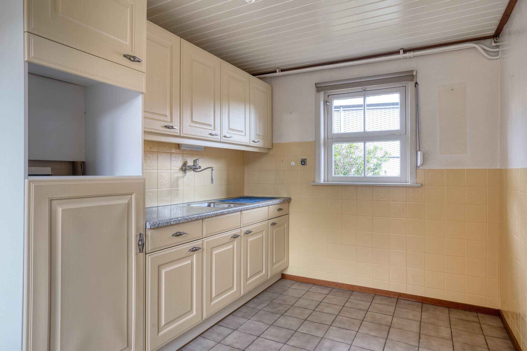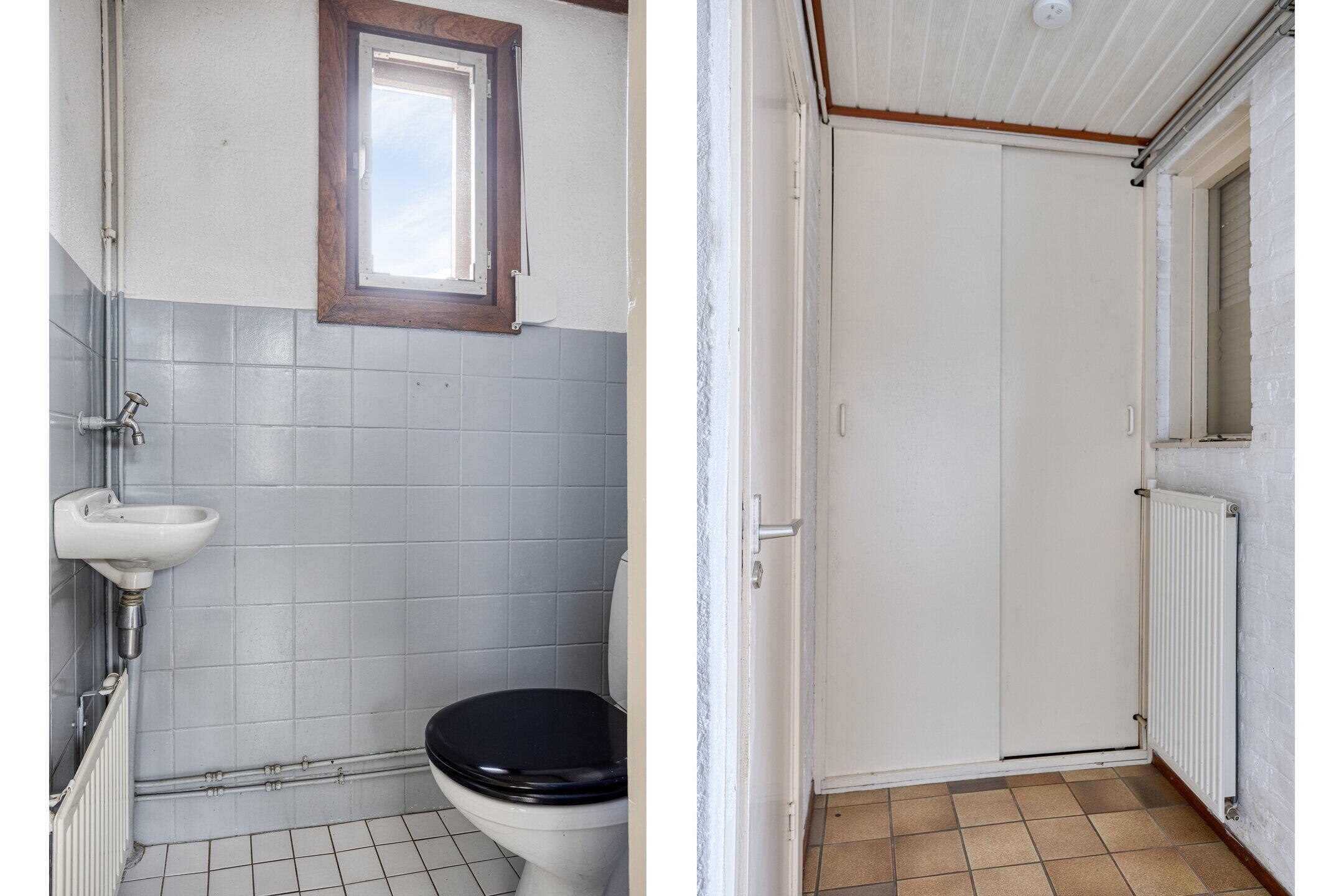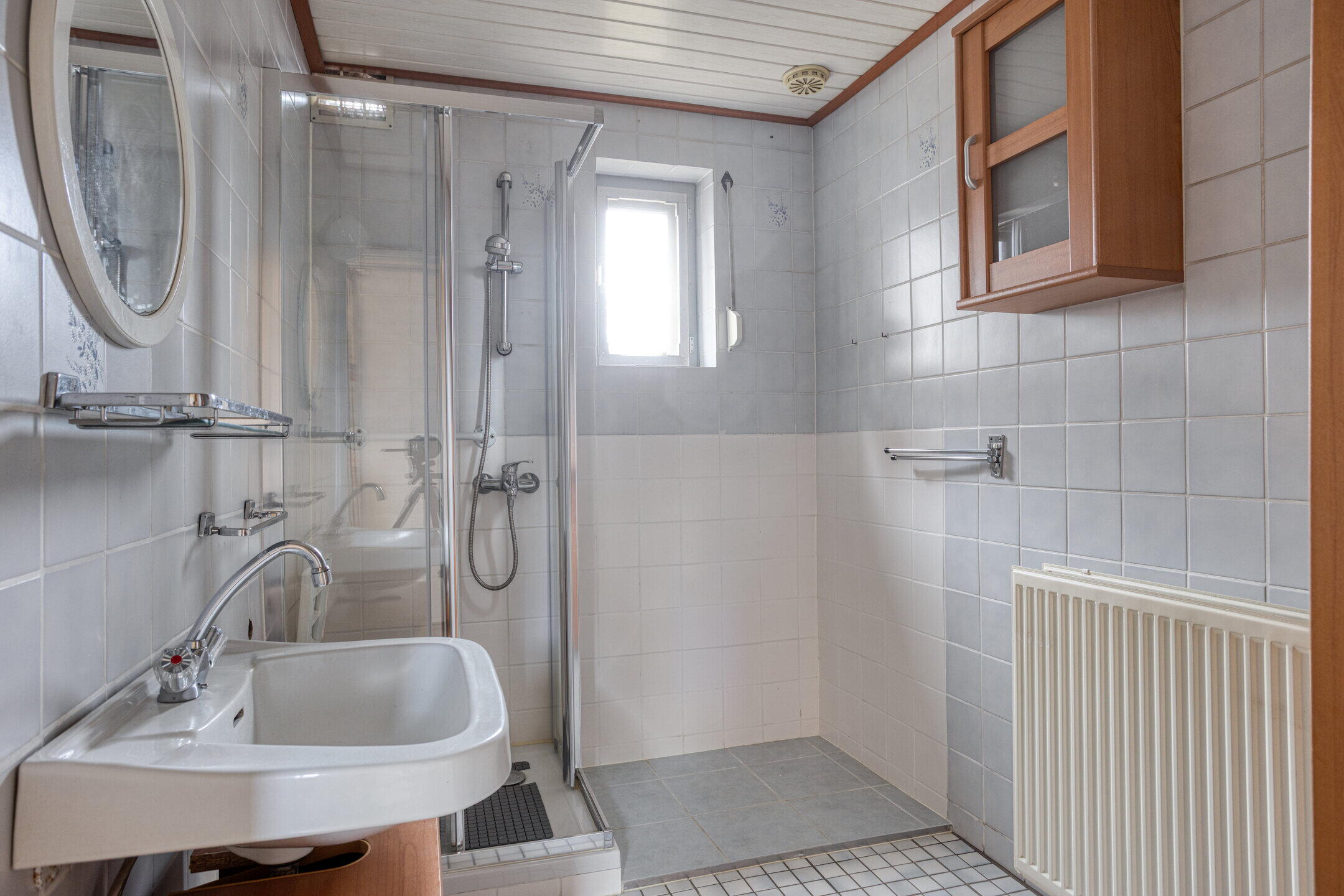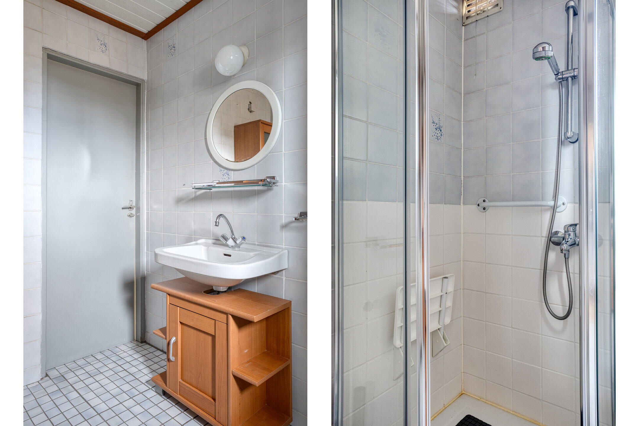 De gesloten keuken is eenvoudig uitgevoerd, maar biedt volop mogelijkheden voor een eigentijdse invulling. Via het achterportaal bereik je de doucheruimte met douche en vaste wastafel, het separaat toilet en de cv-/bergruimte.